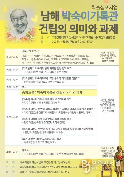브릿지저널 김경미 기자 | 경상국립대학교 사회과학연구원(원장 송원근 경제학부 교수)은 박숙이평화기림사업회 추진위원회(위원장 김정화 남해여성회장) 등과 함께 4월 3일 오후 2~5시 국립창원대학교 남해캠퍼스 사회과학관 4층 혁신지원융합실에서 ‘남해 박숙이기록관 건립의 의미와 과제’를 주제로 학술심포지엄을 개최한다.