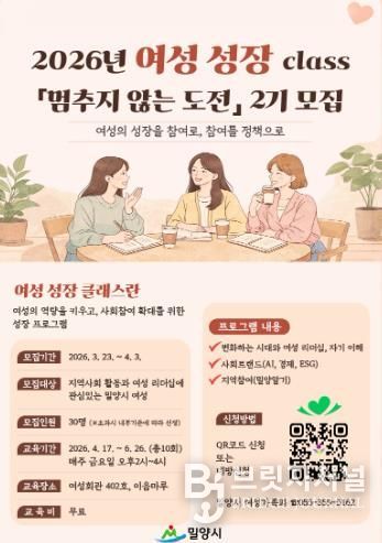 브릿지저널 김경미 기자 | 경남 밀양시는 여성친화도시 조성의 일환으로, 여성의 사회참여 확대와 리더십 역량 강화를 위한 2026년 여성 성장 class ‘멈추지 않는 도전’ 제2기 수강생을 모집한다.