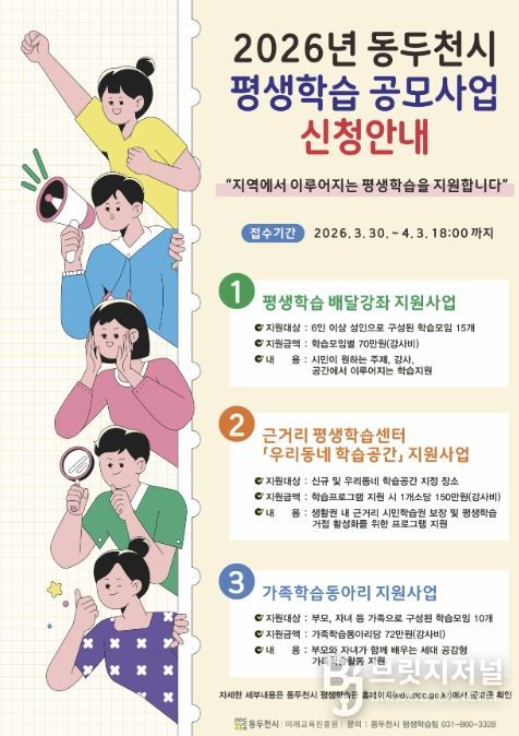 브릿지저널 김경미 기자 | 동두천시는 시민들의 자발적인 학습 문화를 확산하고 지역 평생학습 공동체를 활성화하기 위해 ‘2026년 평생학습 공모사업’ 신청을 오는 3월 30일부터 4월 3일까지 접수한다고 밝혔다.