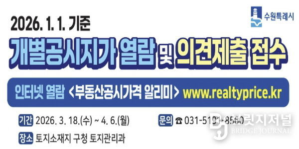 브릿지저널 김경미 기자 | 수원시 영통구는 3월 18일부터 4월 8일까지 20일간 2026년 1월 1일 기준 개별공시지가에 대한 열람을 실시하고 토지소유자 및 이해관계인의 의견을 접수한다.