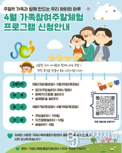 브릿지저널 김경미 기자 | 거제시 육아종합지원센터는 3월부터 11월까지‘가족참여주말체험프로그램’을 운영한다고 밝혔다.