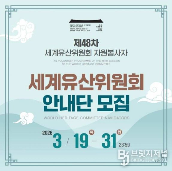 브릿지저널 김경미 기자 | 국가유산청 제48차 세계유산위원회 회의 준비기획단은 7월 부산에서 개최되는 제48차 유네스코 세계유산위원회 회의(48th Session of the World Heritage Committee)에 국내·외 청년들의 국제회의 현장 참여 기회를 제공하기 위하여 '세계유산위원회 안내단(World Heritage Committee Navigators)'의 참가자를 공개 모집한다.
