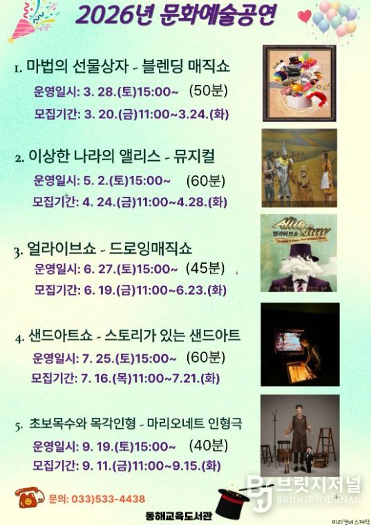 브릿지저널 윤나영 기자 | 동해교육도서관은 3월 28일부터 9월 19일까지 지역주민을 대상으로 문화예술을 가까이에서 체험할 수 있는 총 5개의 공연을 선보일 예정이다.