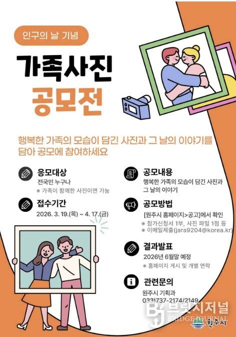 브릿지저널 윤나영 기자 | 원주시는 인구의 날을 기념하여 이야기가 있는 가족사진 공모전을 개최한다.
