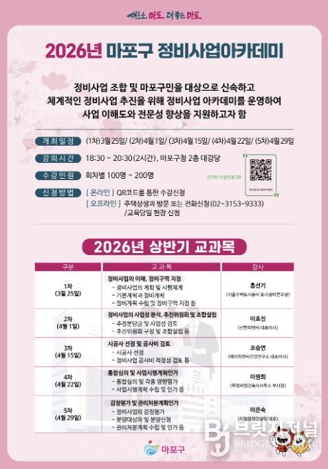 브릿지저널 김경미 기자 | 마포구는 지역 내 정비사업 조합과 주민을 대상으로 ‘2026년 상반기 마포구 정비사업 아카데미’를 3월 25일부터 4월 29일까지 총 5회차에 걸쳐 개최한다.