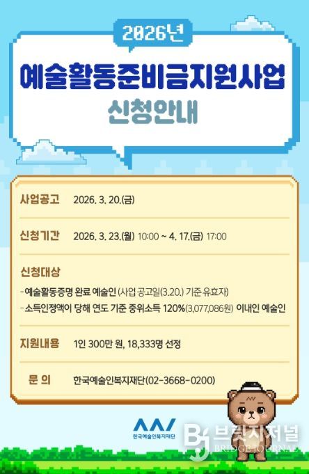 브릿지저널 김경미 기자 | 문화체육관광부는 한국예술인복지재단과 함께 3월 23일부터 4월 17일까지 ‘2026년 예술활동준비금’ 지원 신청을 받는다.