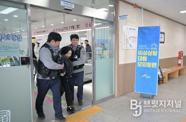 브릿지저널 김경미 기자 | 여주시는 19일 민원토지과에서 여주경찰서와 함께 ‘민원실 비상 상황 대응 모의훈련’을 실시했다.