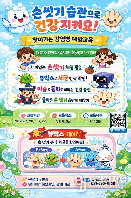 브릿지저널 김경미 기자 | 하남시보건소는 오는 4월 6일부터 10월 2일까지 관내 어린이 대상 ‘손 씻기 교육’을 운영하며, 3월 20일부터 27일까지 관내 교육기관을 대상으로 네이버 폼을 통해 교육 신청을 받는다고 밝혔다.