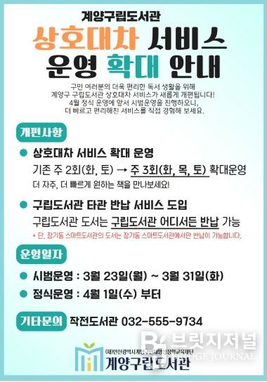 브릿지저널 김경미 기자 | (재)인천광역시계양구인재양성장학교육재단 계양구립도서관은 오는 4월 1일부터 상호대차 서비스 운영을 확대하고, 타관 반납 서비스를 새롭게 도입한다.