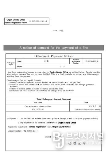 브릿지저널 김경미 기자 | 옹진군이 자동차 과태료 외국인 체납자들을 대상으로, 영어로 번역된‘자동차 과태료 체납 안내문’을 발송한다고 밝혔다.