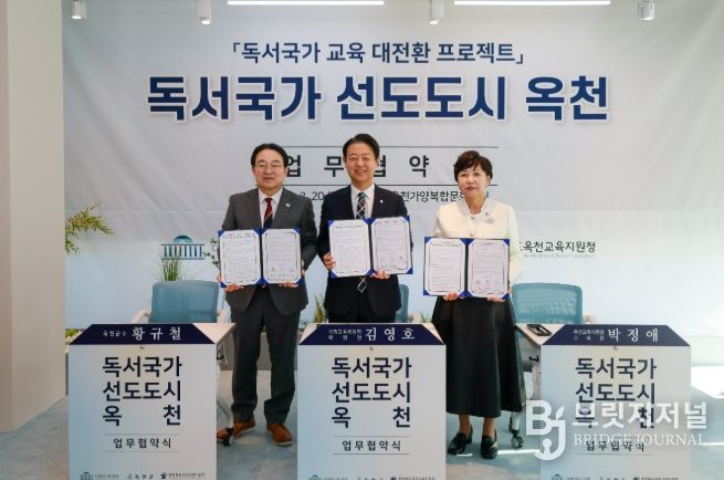 브릿지저널 김경미 기자 | 옥천군은 20일 옥천가양복합문화센터에서 국회 교육위원회, 옥천교육지원청과 함께 ‘독서국가 선도도시 옥천’ 조성을 위한 업무협약을 체결했다고 밝혔다.