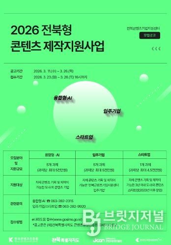 브릿지저널 윤나영 기자 | 전북도의 콘텐츠와 ICT 융합산업 육성을 이끌어가는 (재)전북특별자치도 콘텐츠융합진흥원에서 도내 콘텐츠 기업의 경쟁력 강화와 콘텐츠산업 활성화를 위해 ‘2026 전북형 콘텐츠 제작지원사업’과 ‘2026 콘텐츠 고도화 지원사업’ 참여기업을 모집한다고 밝혔다.