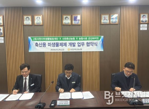 브릿지저널 김경미 기자 | (재)사천시미생물발효재단은 20일 사천축산업협동조합 회의실에서 사천축협 및 군산바이오와 함께 “축산용 미생물제제 개발 및 사업화를 위한 업무협약(MOU)”을 체결했다.