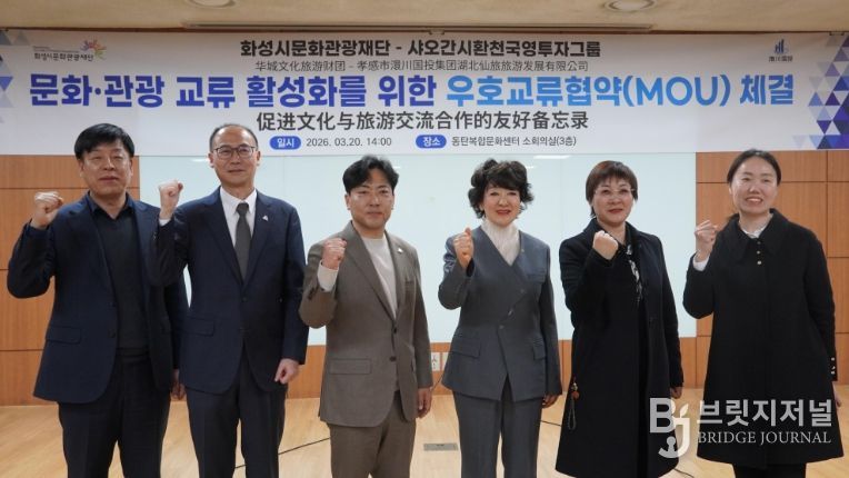 브릿지저널 김경미 기자 | 화성시문화관광재단은 3월 20일 동탄복합문화센터에서 중국 후베이성에 위치한 인구 약 417만 명 규모의 산업·관광 도시 샤오간시의 환천국유투자그룹과 문화·관광 교류 활성화를 위한 업무협약(MOU)을 체결했다.