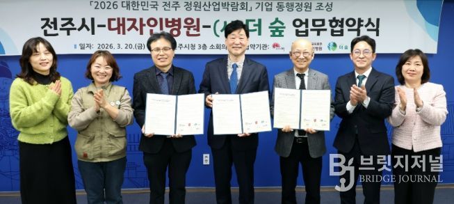 전주시와 대자인병원(이사장 이병관), 사단법인 더숲(대표 정명운)은 20일 시청 3층 소회의실에서 ‘2026 대한민국 전주정원산업박람회’ 기업동행정원 조성을 위한 업무협약을 체결했다.