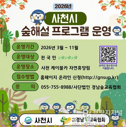 브릿지저널 김경미 기자 | 사천시는 관내 유아숲체험원 5개소(수양공원, 초전공원, 망산공원, 월성공원, 자연휴양림)와 사천 케이블카 자연휴양림에서 운영하는 2026년 산림교육(유아숲·숲해설) 프로그램 참여자를 모집한다고 22일 밝혔다.