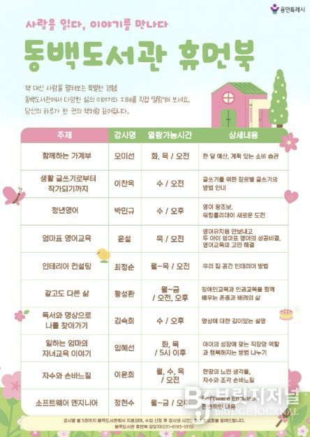 브릿지저널 김경미 기자 | 용인특례시 동백도서관은 오는 4월 1일부터 ‘휴먼북’ 프로그램을 정비해 본격 운영한다고 23일 밝혔다.
