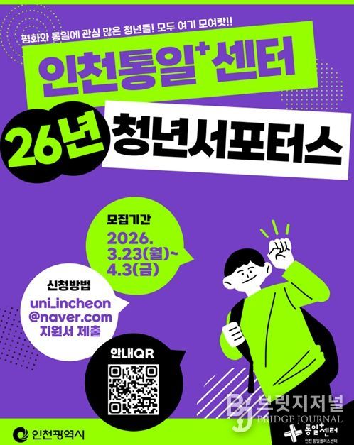 브릿지저널 김경미 기자 | 인천광역시는 청년 주도의 평화·통일 콘텐츠 제작과 확산을 위해 '2026년 인천통일+센터 청년서포터스'를 3월 23일부터 4월 3일까지 모집한다고 밝혔다.