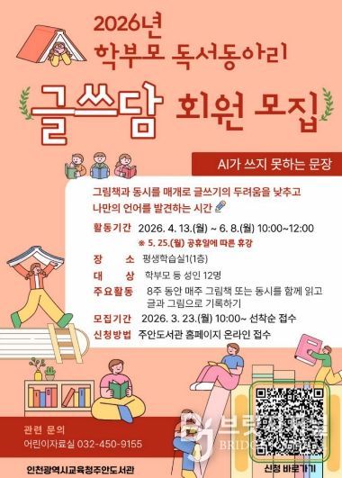 브릿지저널 김경미 기자 | 인천광역시교육청주안도서관은 학부모의 인문학적 소양을 함양하고 가정 내 독서문화를 확산하기 위하여, 오는 23일부터 학부모 독서동아리 ‘글쓰담’ 회원을 모집한다.