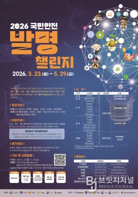 브릿지저널 김경미 기자 | 지식재산처는 관세청, 경찰청, 소방청, 산림청, 해양경찰청과 함께 '2026 국민안전 발명챌린지' 접수를 3월 23일부터 5월 29일까지 진행한다고 밝혔다.
