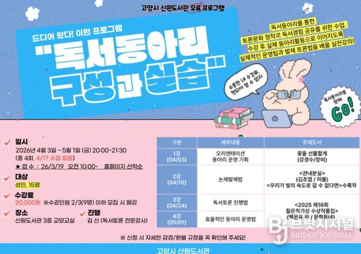 브릿지저널 김경미 기자 | 고양특례시 신원도서관은 논제 발제법과 독서동아리 운영법을 다루는 실전형 강의 ‘독서동아리 구성과 실습’을 오는 4월 도서관 3층 교양교실에서 진행한다.