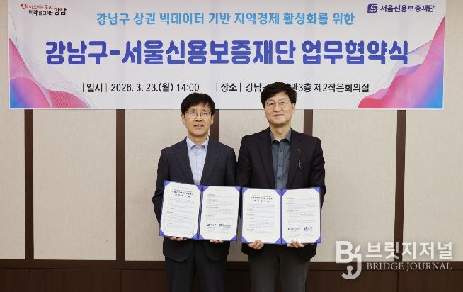 브릿지저널 김경미 기자 | 꿈이 모이는 도시, 미래를 그리는 강남구가 3월 23일 구청에서 서울신용보증재단과 업무협약을 체결하고, 지역상권 활성화와 소상공인 지원을 위한 빅데이터 기반 협력체계 구축에 나섰다. 상권 현황을 보다 정밀하게 분석해 지역 특성에 맞는 정책을 발굴하고, 소상공인이 체감할 수 있는 지원책으로 연결하겠다는 취지다.