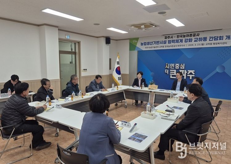 브릿지저널 김경미 기자 | 파주시농업기술센터는 지난 23일 교하동 행정복지센터에서 한국농어촌공사 파주지사와 함께 농업생산기반시설의 효율적 관리를 위한 협력 방안을 논의하는 간담회를 개최했다.
