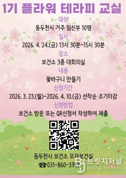 이번 플라워테라피 태교 교실은 4월 24일 보건소 3층 대회의실에서 진행하며 신청 기간은 오는 10일까지로 동두천시 보건소에 등록된 임신부를 선착순 모집한다.