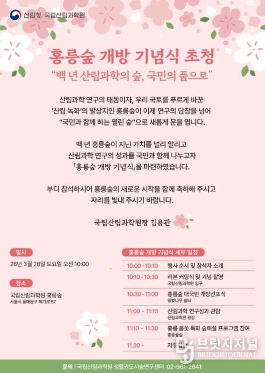 브릿지저널 김경미 기자 | 산림청 국립산림과학원은 28일 오전 10시 서울특별시 동대문구 홍릉숲에서 ‘홍릉숲 개방 기념식’을 개최한다고 밝혔다.