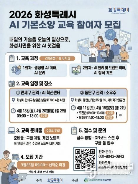 브릿지저널 김경미 기자 | 화성특례시가 시민이 직접 AI 교육을 확산하는 선순환 생태계를 조성하고자 ‘2026년 AI 시민 리더 양성 교육’ 참여자를 모집한다.