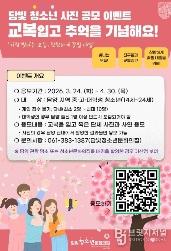 브릿지저널 김경미 기자 | 담빛청소년문화의집은 개학을 맞아 지역 청소년들의 학교생활과 성장의 순간을 기록하고, 또래와의 소중한 추억을 사진으로 남길 수 있도록 ‘담빛 청소년 사진 공모 이벤트’를 개최한다고 밝혔다.