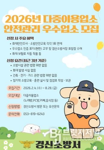 브릿지저널 정보영 기자 | 경산소방서는 다중이용업소 관계인의 자율안전관리 문화 정착과 안전한 영업 환경 조성을 위해 ‘2026년 다중이용업소 안전관리 우수업소’를 선정한다고 밝혔다.