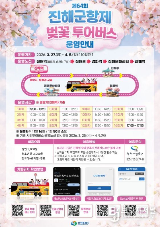 브릿지저널 김경미 기자 | 창원특례시는 오는 3월 27일부터 4월 5일까지 열흘간 제64회 진해군항제와 연계한 ‘벚꽃 투어버스’ 특별 노선을 운영한다.
