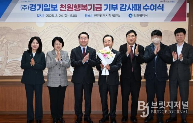 브릿지저널 김경미 기자 | 인천광역시는 3월 24일 시청 접견실에서 인천 문화예술 진흥을 위한 ‘천원행복기금’ 민간 1호 기탁자인 ㈜경기일보와 김기태 인천본부 사장에게 감사패를 수여했다고 밝혔다.