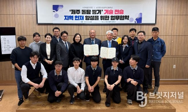 브릿지저널 정보영 기자 | 제주특별자치도 돌문화공원관리소(소장 이상효)와 서귀포산업과학고등학교(교장 문경삼)가 24일 오전 서귀포산업과학고등학교에서 ‘제주 돌담 쌓기’ 기술의 전승과 전문 인력 양성을 위한 업무협약을 맺었다.