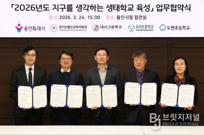 브릿지저널 김경미 기자 | 용인특례시는 24일 시청 접견실에서 용인교육지원청을 비롯해 3개 학교와 ‘지구를 생각하는 생태학교 육성사업’을 위한 협약을 맺었다.