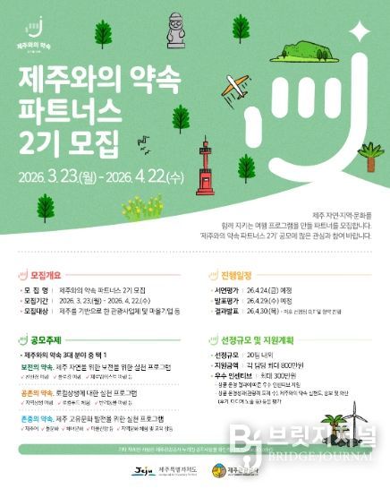 브릿지저널 정보영 기자 | 제주특별자치도와 제주관관공사(사장 고승철)는 오는 4월 22일까지 온라인 채널을 통해 지속 가능한 제주관광을 위한 실천프로젝트 지원사업인 ‘제주와의 약속 파트너스 2기’ 공모를 추진하고 있다고 24일 밝혔다.