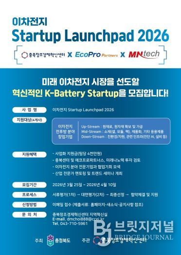 브릿지저널 김경미 기자 | 충북도가 이차전지 혁신 기술을 보유한 스타트업을 발굴해 육성하는 '이차전지 스타트업 육성 플랫폼 구축 지원사업(이차전지 Startup Launchpad 2026)' 참여 기업을 4월 10일까지 모집한다.