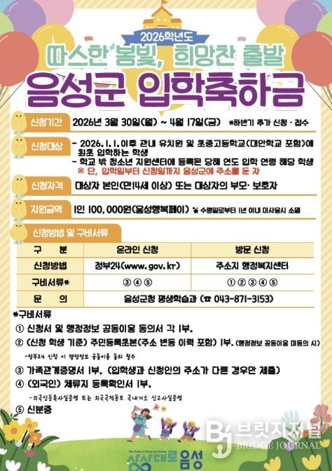 브릿지저널 김경미 기자 | 음성군은 올해 2026학년도 입학을 맞아 관내 유치원과 초·중·고등학교 입학생, 그리고 학교 밖 청소년지원센터에 등록된 입학 연령에 해당되는 청소년을 대상으로 입학축하금을 지원한다고 밝혔다.