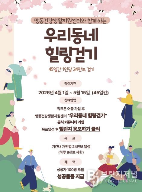 브릿지저널 김경미 기자 | 충북 음성군 맹동건강생활지원센터는 주민들의 걷기 실천율을 높이고 비만, 우울, 고혈압 등 기저질환 관리를 돕기 위해 오는 4월부터 ‘우리동네 힐링걷기’ 챌린지를 운영한다.