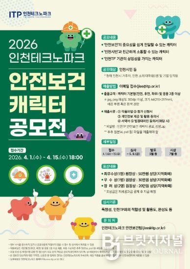 브릿지저널 김경미 기자 | 인천테크노파크(인천TP)는 오는 4월 1일부터 인천시민과 함께 안전보건 공감대 형성을 위한 ‘2026년 인천테크노파크 안전보건 캐릭터 공모전’을 개최한다.