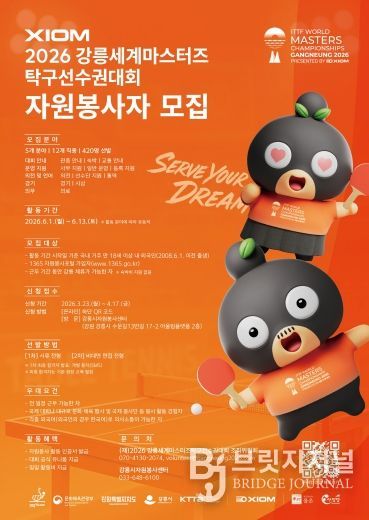 브릿지저널 윤나영 기자 | 강릉시에서 열리는 ‘XIOM 강릉세계마스터즈탁구선수권대회’의 성공적인 개최를 위해 대회 조직위원회가 3월 23일부터 4월 17일까지 자원봉사자를 모집한다고 밝혔다.