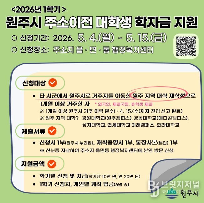 브릿지저널 윤나영 기자 | 원주시는 전입신고를 마치고 원주시민이 된 대학생에게 상·하반기 각 10만 원씩 연간 20만 원의 학자금을 지원한다.