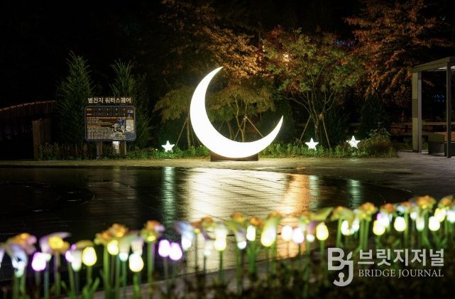 별천지공원과 삼기저수지 일대에 조성된 경관조명이 은은하게 켜지며 낮과는 다른 분위기의 산책로가 펼쳐진다.