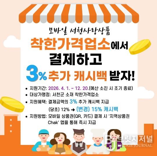 브릿지저널 정보영 기자 | 서천군은 고물가로 인한 군민 생활비 부담을 덜고 지역 소상공인과의 상생을 도모하기 위해 오는 4월 1일부터 12월 20일까지 ‘착한가격업소 모바일 서천사랑상품권 추가 지원사업’을 시행한다.