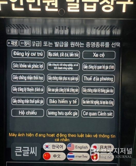 브릿지저널 김경미 기자 | 서울 중구는 한국어가 서툰 다문화 가족과 귀화 주민을 위해 무인민원발급기에 ‘외국어 지원 서비스’를 도입하고 시범 운영에 들어갔다. 시범 운영 장소는 외국인 방문이 잦은 중구청사와 다문화 거주 비율이 높은 광희동 주민센터 두 곳이다.