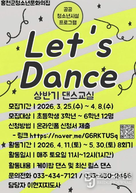 브릿지저널 윤나영 기자 | 홍천군청소년문화의집은 지역 내 초등학생 3학년부터 6학년까지의 청소년을 대상으로 공공 청소년시설 프로그램 “댄스 교실 Let’s Dance” 상반기 참가자를 모집한다.