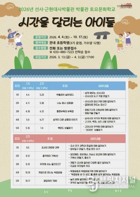 브릿지저널 윤나영 기자 | 양구 선사·근현대사박물관은 4월 4일부터 10월 17일까지 초등학생을 대상으로 토요문화학교 ‘시간을 달리는 아이들’을 운영한다.