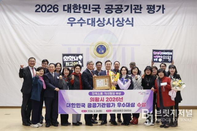 브릿지저널 김경미 기자 | 의왕시가 3월 24일 국회의원회관 대회의실에서 열린 ‘2026 대한민국 공공기관평가 우수대상’시상식에서‘정책소통·적극행정 부문’에 선정되는 영예를 안았다.