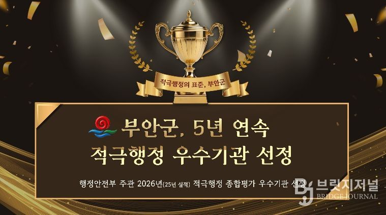 브릿지저널 윤나영 기자 | 부안군은 행정안전부에서 주관한 2026년(2025년 실적) 지방정부 적극행정 종합평가에서 우수기관으로 선정돼 지난 2021년 하반기 성과 점검부터 5년 연속 우수기관 선정이라는 금자탑을 쌓았다고 밝혔다.